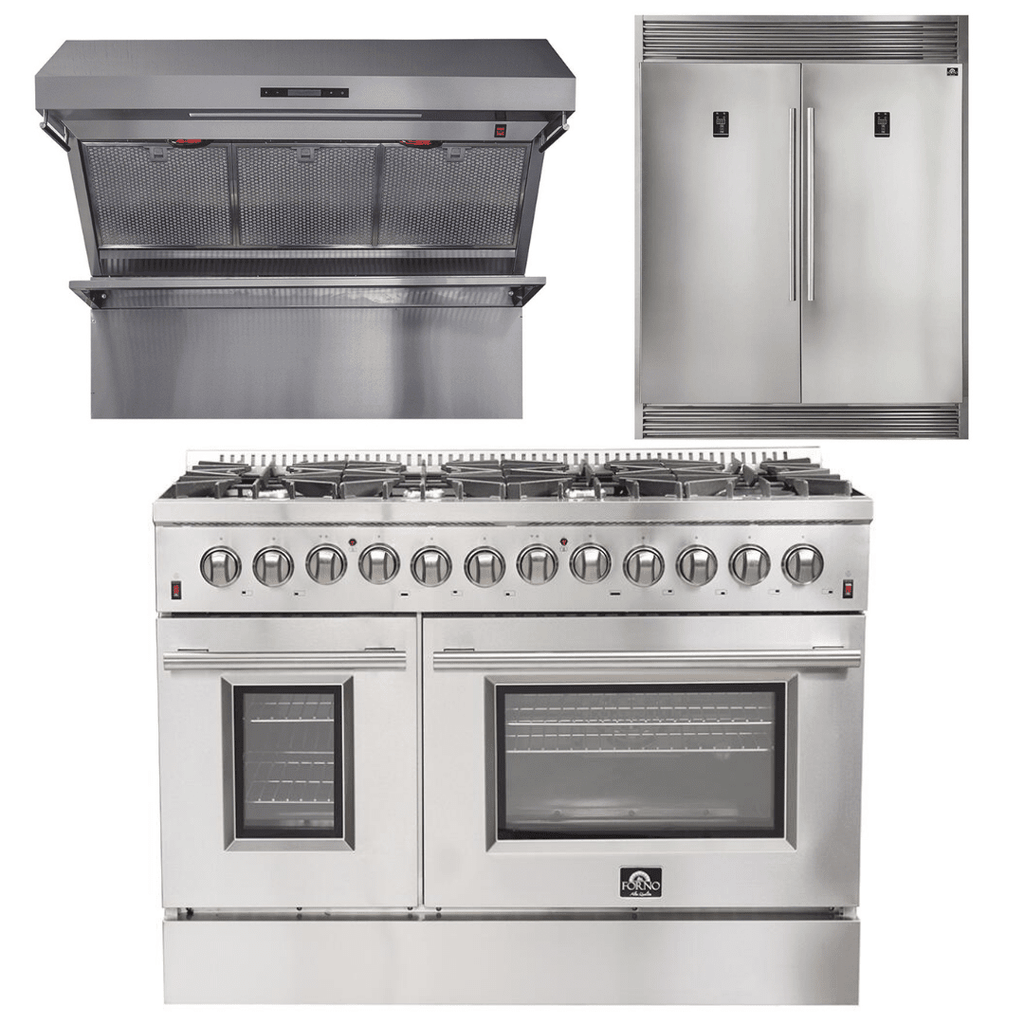 Forno Appliance Package - 48 Inch Dual Fuel Range, Wall Mount Range Hood, 60 Inch Refrigerator, FBDL-017-02US