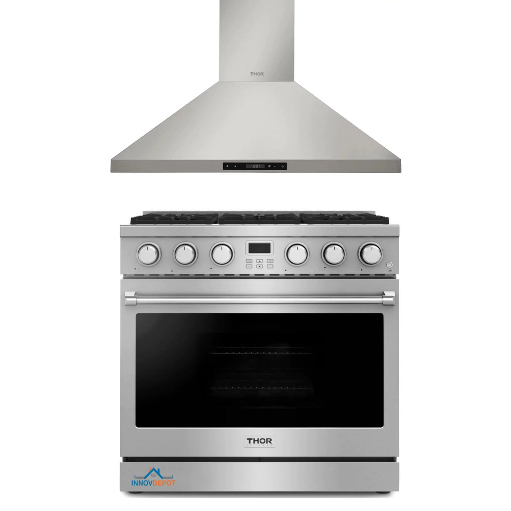 Thor Kitchen 2-Piece Appliance Package - 36-Inch Gas Range and Wall Mount Range Hood in Stainless Steel
