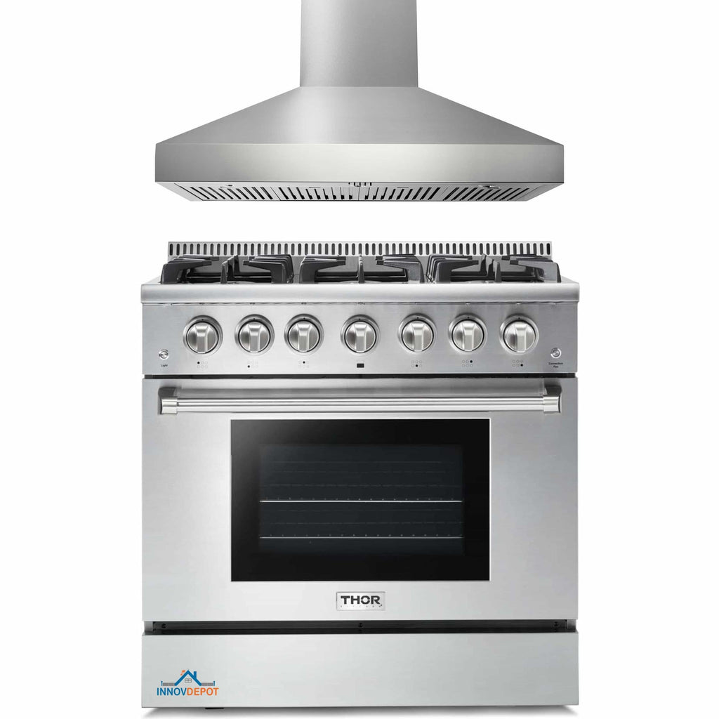 Thor Kitchen 2-Piece Pro Appliance Package - 36-Inch Gas Range & Pro-Style Wall Mount Hood in Stainless Steel
