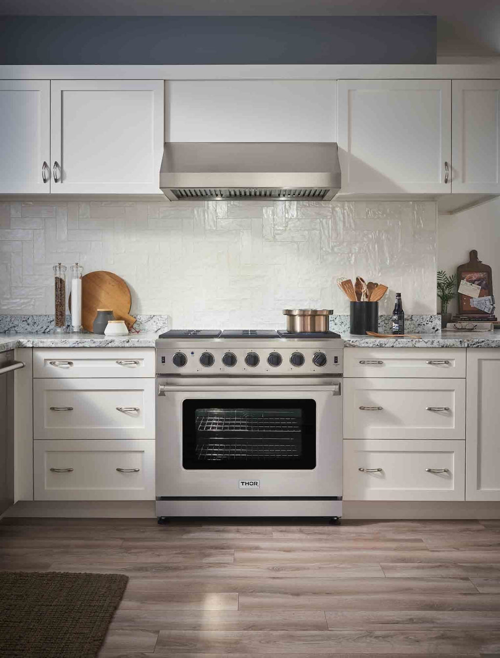 Thor Kitchen 4-Piece Appliance Package - 36-Inch Gas Range, Refrigerator with Water Dispenser, Dishwasher, & Microwave Drawer in Stainless Steel