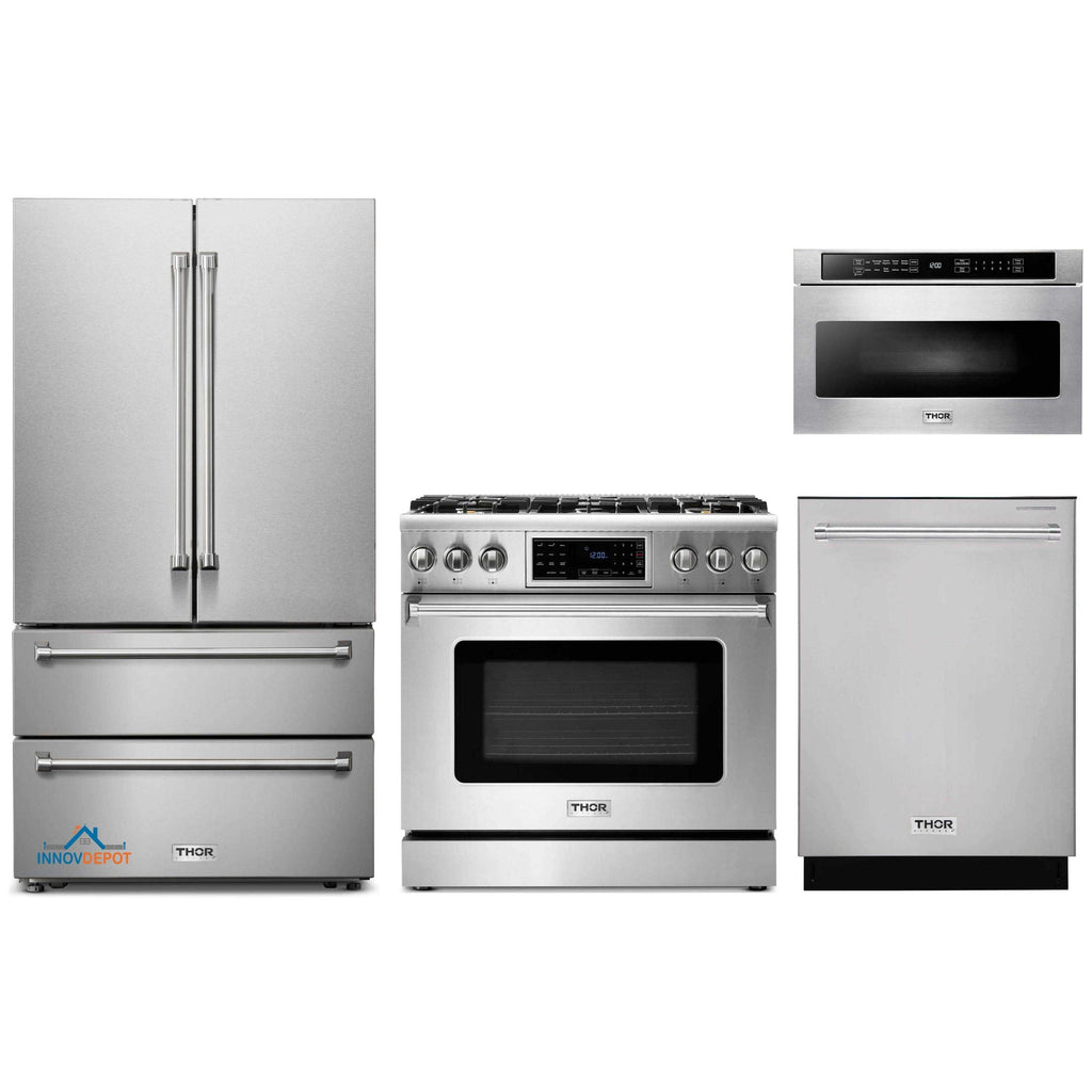 Thor Kitchen 4-Piece Appliance Package - 36-Inch Gas Range with Tilt Panel, French Door Refrigerator, Dishwasher, and Microwave Drawer in Stainless Steel