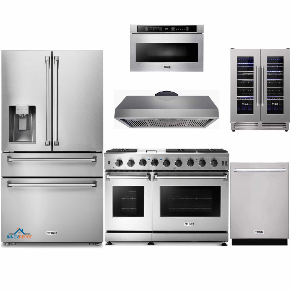 Thor Kitchen 6-Piece Appliance Package - 48-Inch Gas Range, Refrigerator with Water Dispenser, Under Cabinet 16.5-Inch Tall Hood, Dishwasher, Microwave Drawer, & Wine Cooler in Stainless Steel