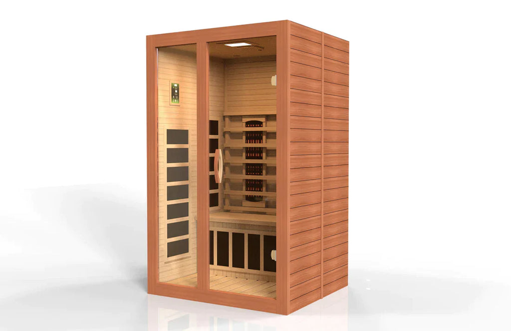 Dynamic Saunas are constructed of Canadian Reforested Red Cedar that emits a natural aroma to enhance your sauna experience. This sauna also features are newest Full Spectrum heating technology, floor heater, MP3 Aux and Bluetooth capability, privacy glass and Chromotherapy Lighting.