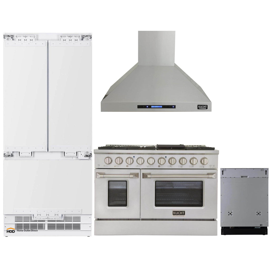 Kucht 4-Piece Appliance Package - 48" Dual Fuel Range, 36" Panel Ready Refrigerator, Wall Mount Hood, & Panel Ready Dishwasher