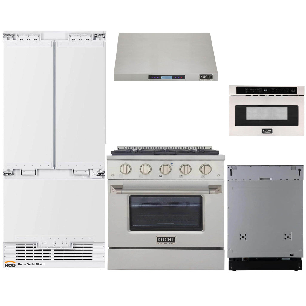 Kucht 5-Piece Appliance Package - 30-Inch Dual Fuel Range, 36-Inch Panel Ready Refrigerator, Under Cabinet Hood, Panel Ready Dishwasher, & Microwave Drawer