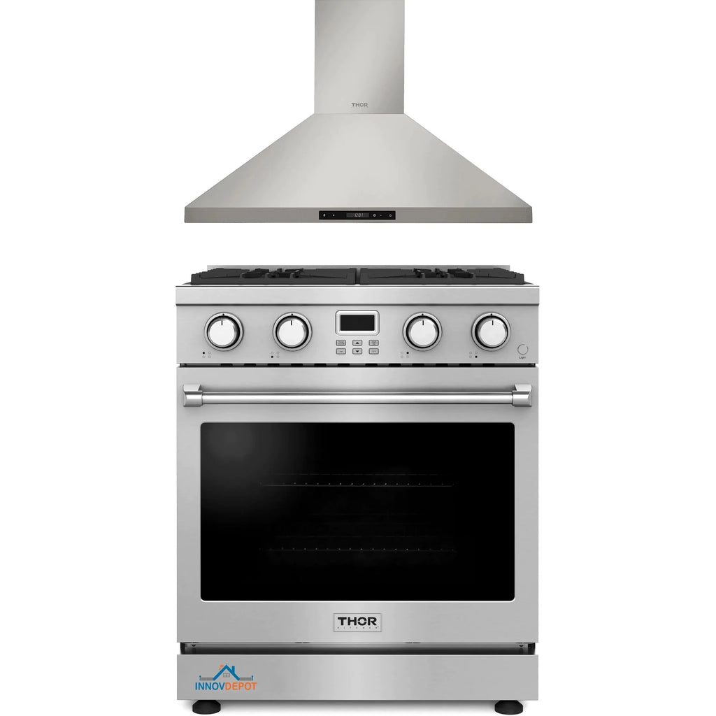 Thor Kitchen 2-Piece Appliance Package - 30-Inch Gas Range and Wall Mount Range Hood in Stainless Steel