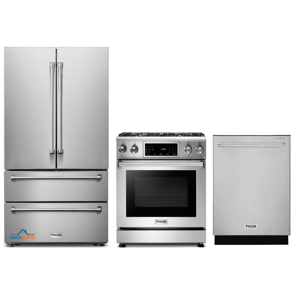 Thor Kitchen 3-Piece Appliance Package - 30-Inch Gas Range with Tilt Panel, Dishwasher & Refrigerator in Stainless Steel