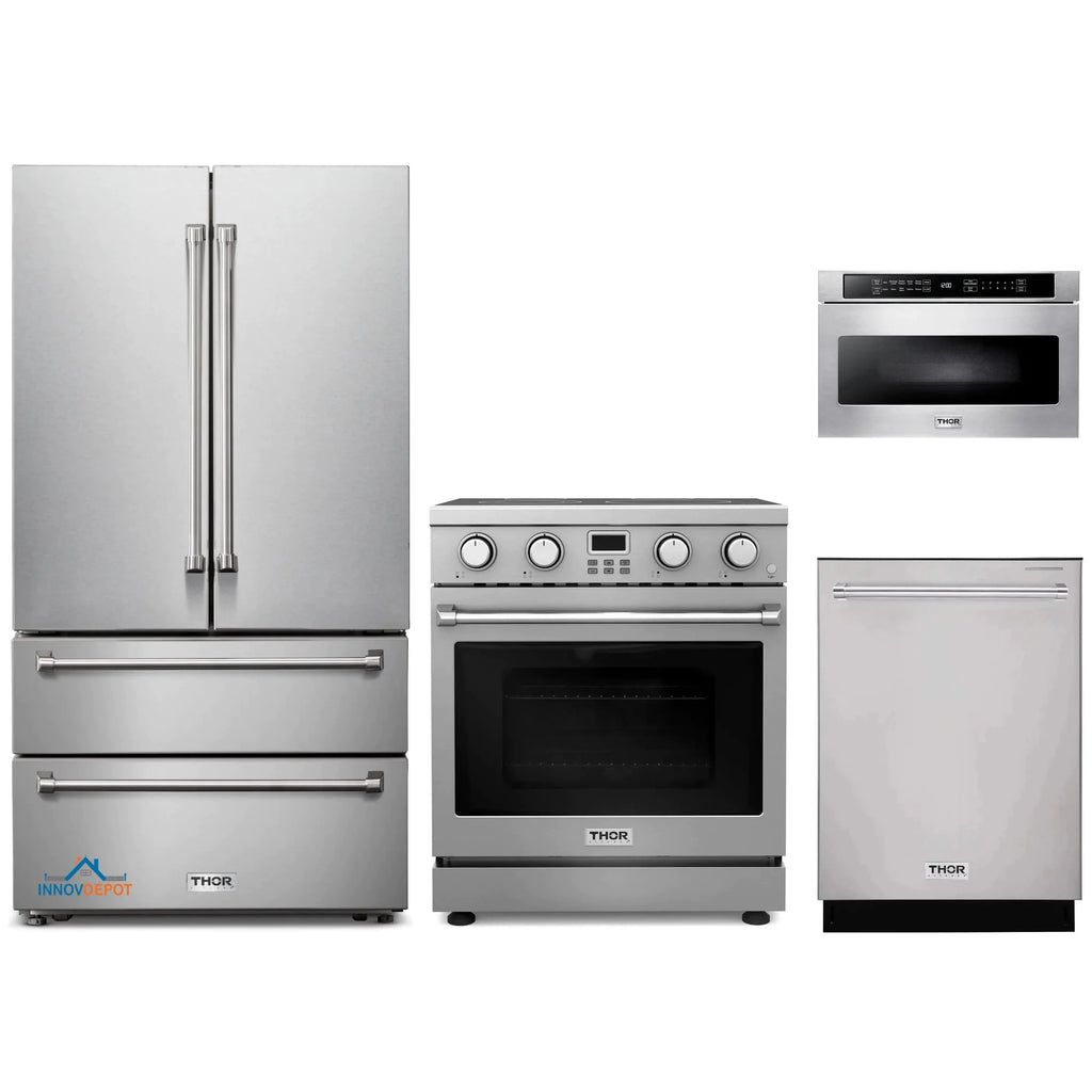 Thor Kitchen 4-Piece Appliance Package - 30-Inch Electric Range, Refrigerator, Dishwasher, and Microwave in Stainless Steel