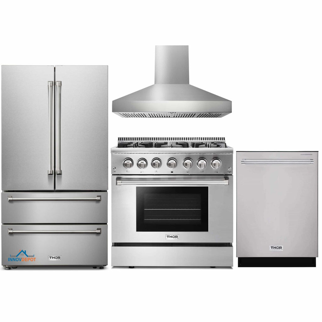 Thor Kitchen 4-Piece Pro Appliance Package - 36-Inch Dual Fuel Range, French Door Refrigerator, Pro-Style Wall Mount Hood and Dishwasher in Stainless Steel