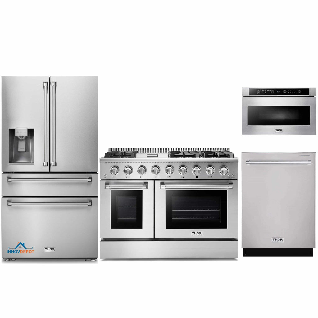 Thor Kitchen 4-Piece Pro Appliance Package - 48-Inch Gas Range, Refrigerator with Water Dispenser, Dishwasher, & Microwave Drawer in Stainless Steel
