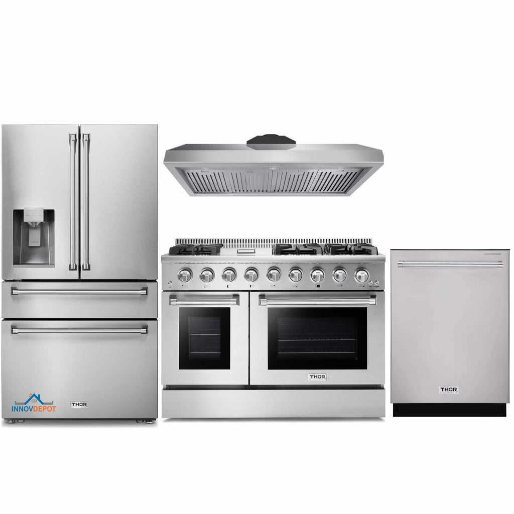 Thor Kitchen 4-Piece Pro Appliance Package - 48-Inch Gas Range, Under Cabinet 11-Inch Tall Hood, Refrigerator with Water Dispenser, & Dishwasher in Stainless Steel