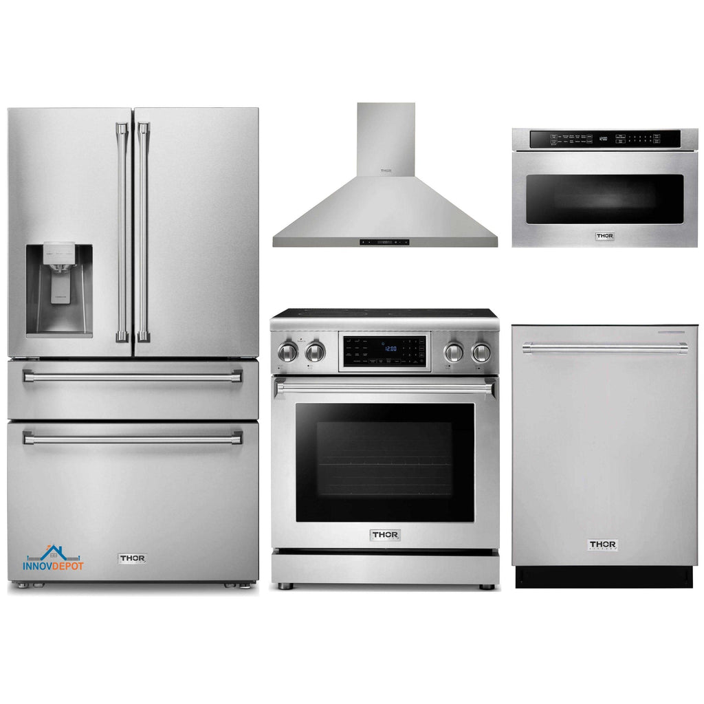 Thor Kitchen 5-Piece Appliance Package - 30-Inch Electric Range with Tilt Panel, Refrigerator with Water Dispenser, Wall Mount Hood, Dishwasher, & Microwave Drawer in Stainless Steel