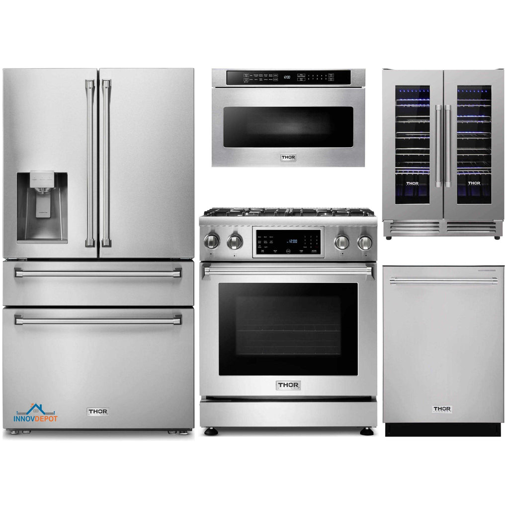 Thor Kitchen 5-Piece Appliance Package - 30-Inch Gas Range with Tilt Panel, Refrigerator with Water Dispenser, Dishwasher, Microwave Drawer, & Wine Cooler in Stainless Steel
