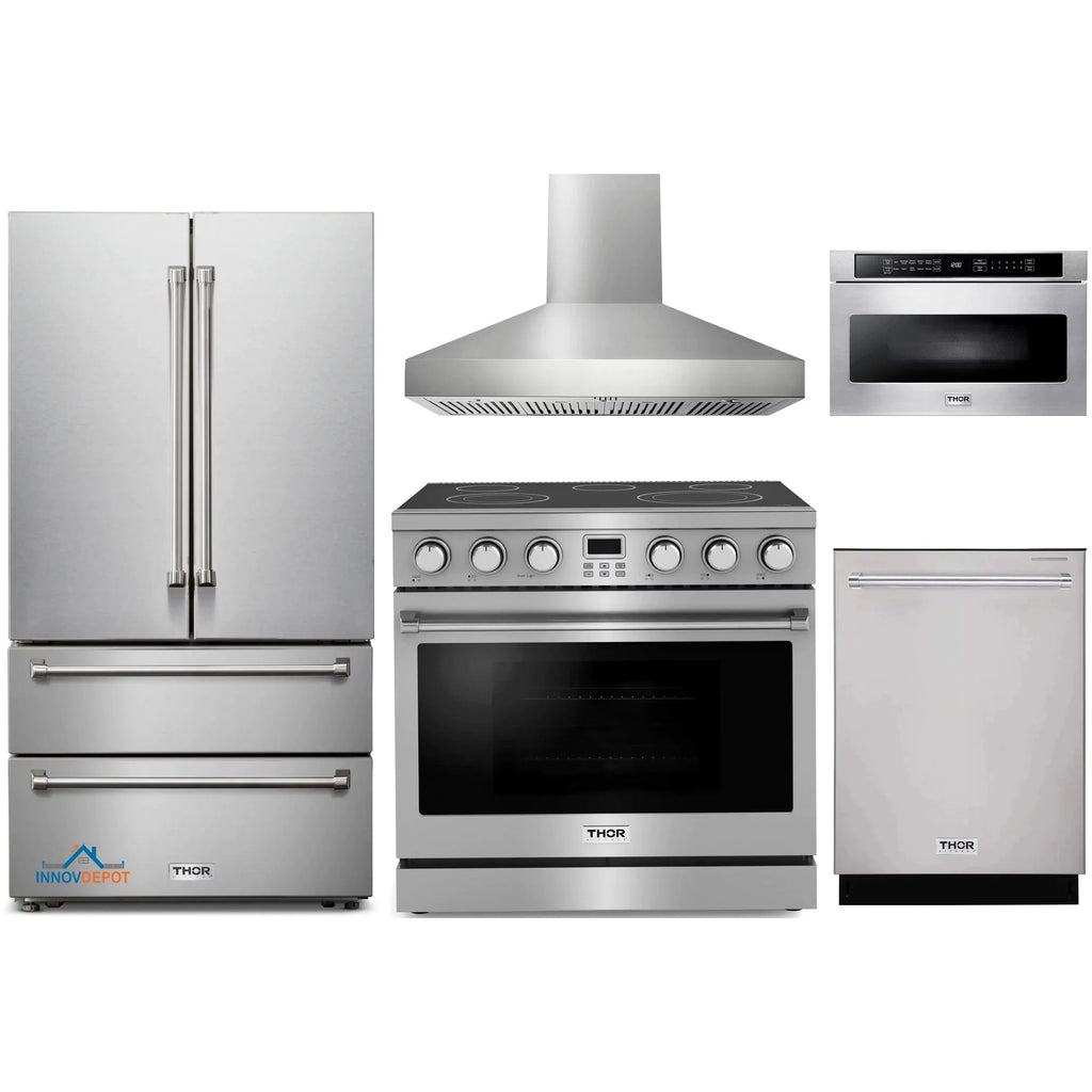 Thor Kitchen 5-Piece Appliance Package - 36-Inch Electric Range, Pro-Style Wall Mount Range Hood, Refrigerator, Dishwasher, and Microwave in Stainless Steel