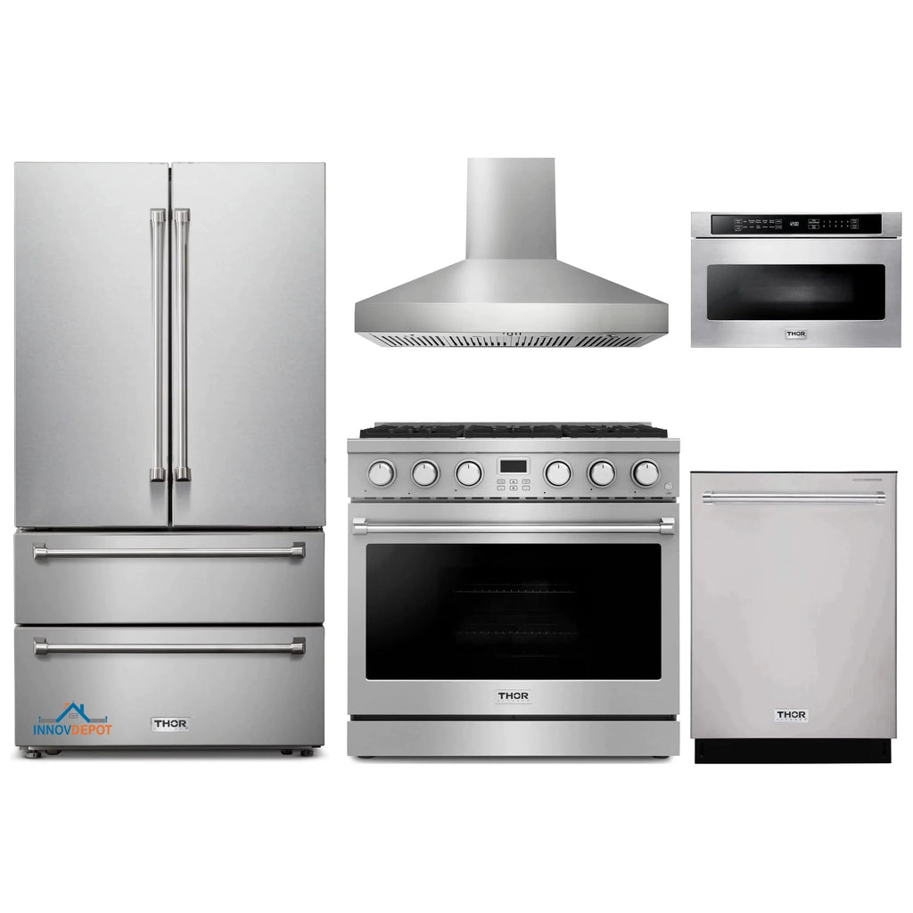 Thor Kitchen 5-Piece Appliance Package - 36-Inch Gas Range, Pro-Style Wall Mount Range Hood, Refrigerator, Dishwasher, and Microwave in Stainless Steel