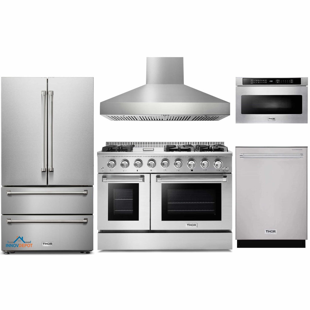 Thor Kitchen 5-Piece Pro Appliance Package - 48-Inch Gas Range, French Door Refrigerator, Dishwasher, Pro Wall Mount Hood, and Microwave Drawer in Stainless Steel