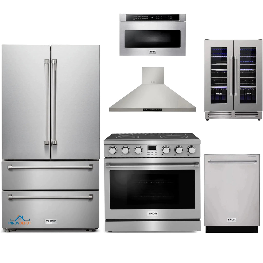 Thor Kitchen 6-Piece Appliance Package - 36-Inch Electric Range, Wall Mount Range Hood, Refrigerator, Dishwasher, Microwave, and Wine Cooler in Stainless Steel