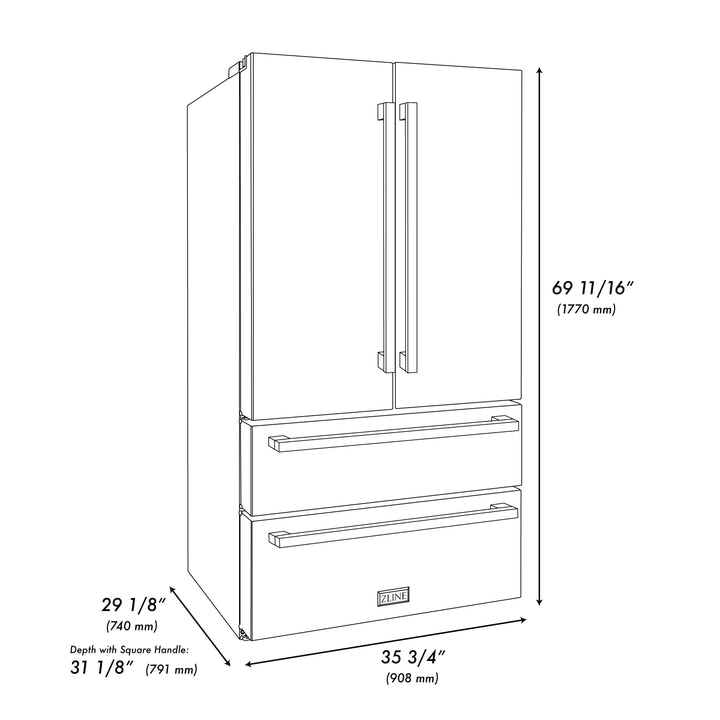 ZLINE Autograph Edition 36-Inch 22.5 cu. ft 4-Door French Door Refrigerator with Ice Maker in Stainless Steel with Polished Gold Square Handles (RFMZ-36-FG)